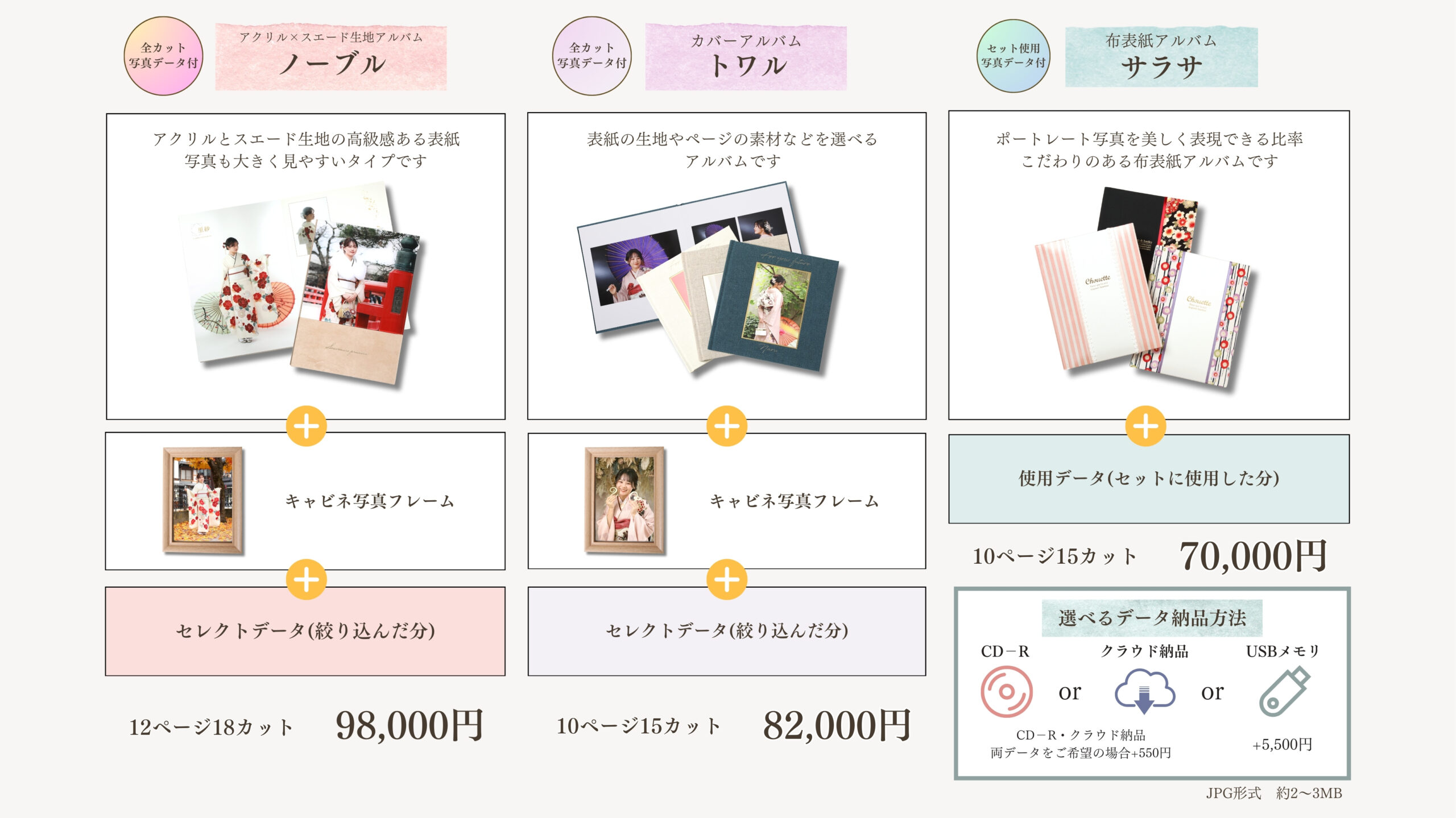 前撮りパックはお支度代と撮影料金がセットになってお得です。